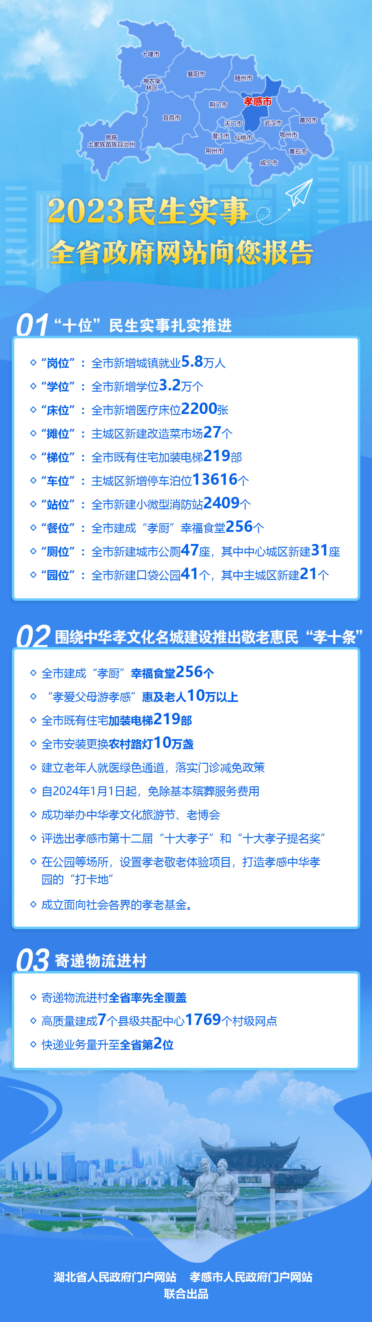 新增婴幼儿托位、建设冬暖夏凉温情教室、老年人居家适老化改造、兴建社区幸福食堂、修好通村公路、开通乡镇公交专线、增加城区停车位和新能源充电桩、改善医疗条件……近期,湖北各地召开的“两会”,陆续公布了2023年民生实事办理情况,全省政府网站将一一向您报告!让我们怀揣共同缔造美好生活的愿景,奔向更加“荆”彩的2024!