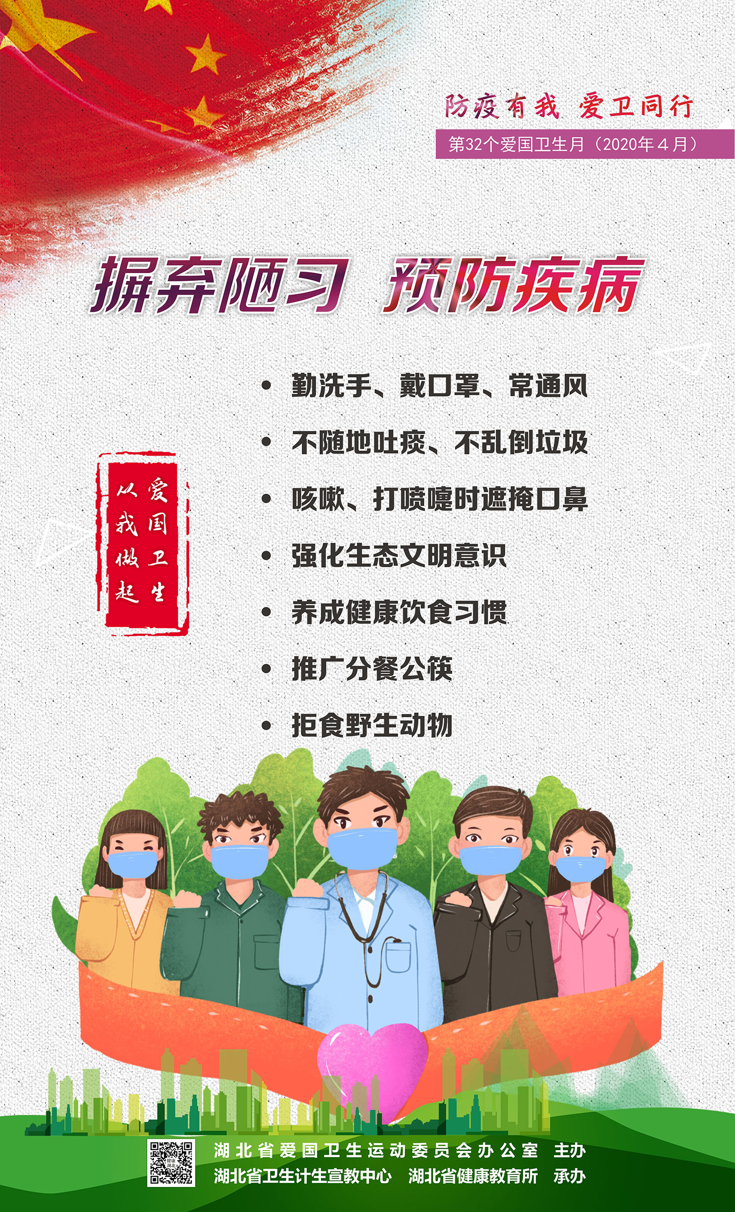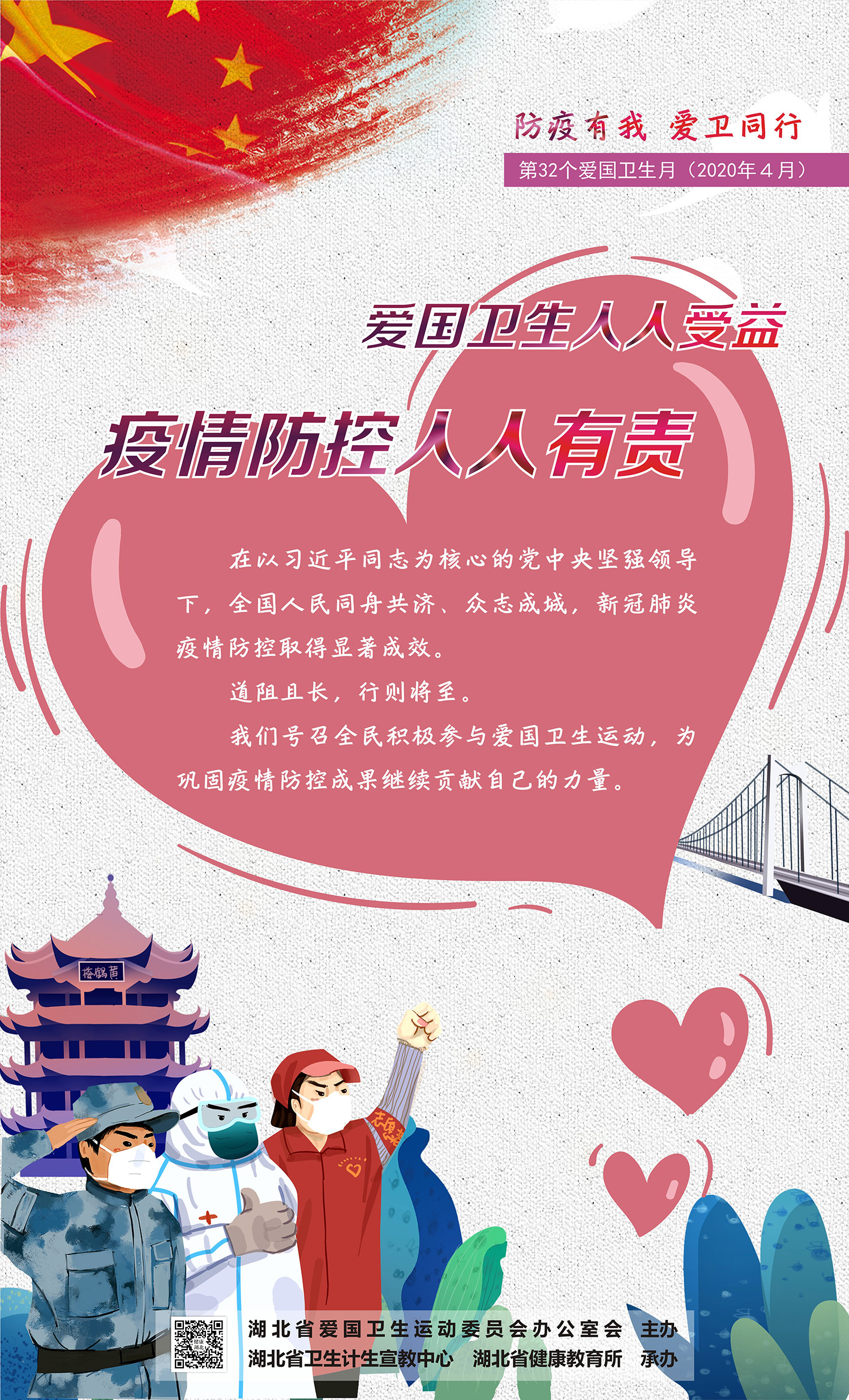 防疫有我,爱卫同行。在抗击新冠肺炎疫情斗争中,湖北人民识大体、顾大局,自觉配合疫情防控工作,展现出坚韧不拔的顽强斗志和公而忘私的奉献精神。值此第32个爱国卫生月来临之际,我们号召全体人民积极参与爱国卫生运动,为巩固疫情防控成果、建设健康湖北继续贡献自己的力量。我们倡议: