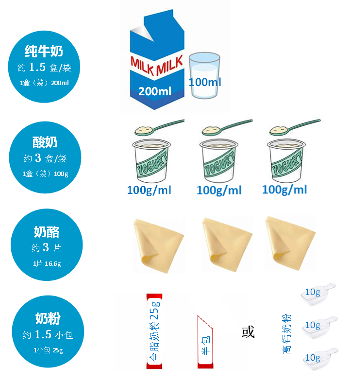 √吃各种各样的奶制品,摄入量相当于每天300ml以上液态奶。