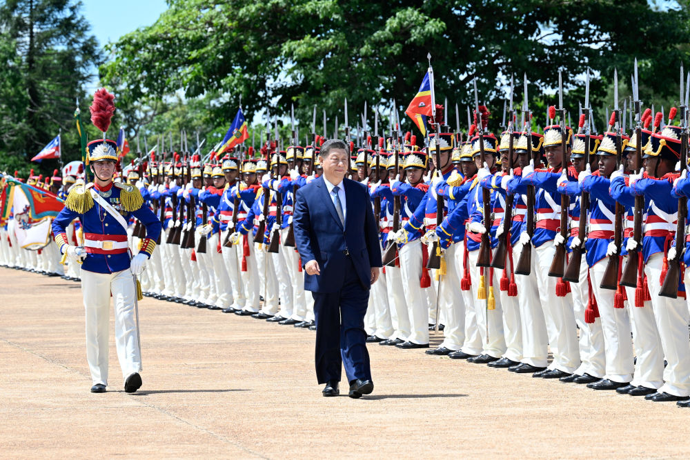 军乐团奏中巴两国国歌。两国元首一同观看仪仗队分列式。中巴儿童挥舞两国国旗热烈欢迎习近平。巴西艺术家用中文演唱《我的祖国》。