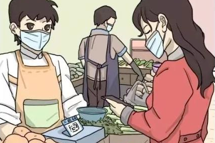 买菜购物时与人保持1米以上距离,尽量别闲聊,更不能拉下口罩交谈、进食。
