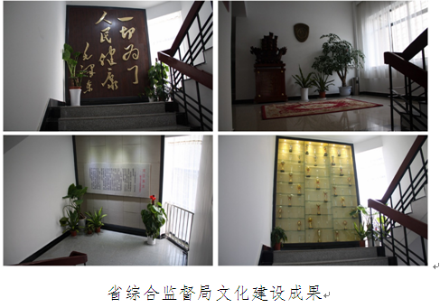 省综合监督局以办公楼为文化展示窗口,统一规划、精心设计,建设了全省卫生计生监督合影照片墙、历史陈列室、荣誉墙、人物群英谱,展示全省卫生计生监督工作风采;设置社会主义核心价值观、依法治国警言警句、卫生计生监督执法宗旨等标语、标志,大力弘扬以责任、忠诚、清廉、公正为核心的执法理念;建设党员活动室、文化图书室、道德讲堂、培训中心丰富干部职工精神文化生活,推动学习型机关建设,营造文化氛围,全面提高干部职工政治素质、思想素质、业务素质和文化素质,提升了卫生计生监督机关管理水平。
